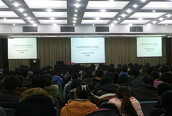 12月18日下午,学校在图书馆多功能厅举行党的十八届三中全会精神专题辅导报告会,徐州市委宣讲团成员、市委党校李作峰教授应邀作专题辅导报告。学校二级党校教师和全校600余名入党积极分子听取了报告会,报告会由校党校副校长、宣传部刘一飞部长主持。