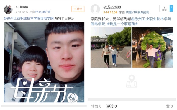 本次活动@乐动网站网页版信电学院官方微博即可参加,学生们通过微博晒出自己对妈妈的祝福,一条短信、一张合影、一个红包……以最简单、质朴的方式向母亲致以节日的问候。截止5月14日上午10点,共有近百人参加此次活动,活动转发量300余次。