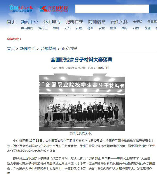 10月12日,由全国石油和化工职业教育教学指导委员会、全国轻工职业教育教学指导委员会主办,石化行指委高职高分子材料生产及加工类专委会、乐动网站网页版等承办的第二届全国职业院校学生高分子材料创新创业大赛在徐州落幕。