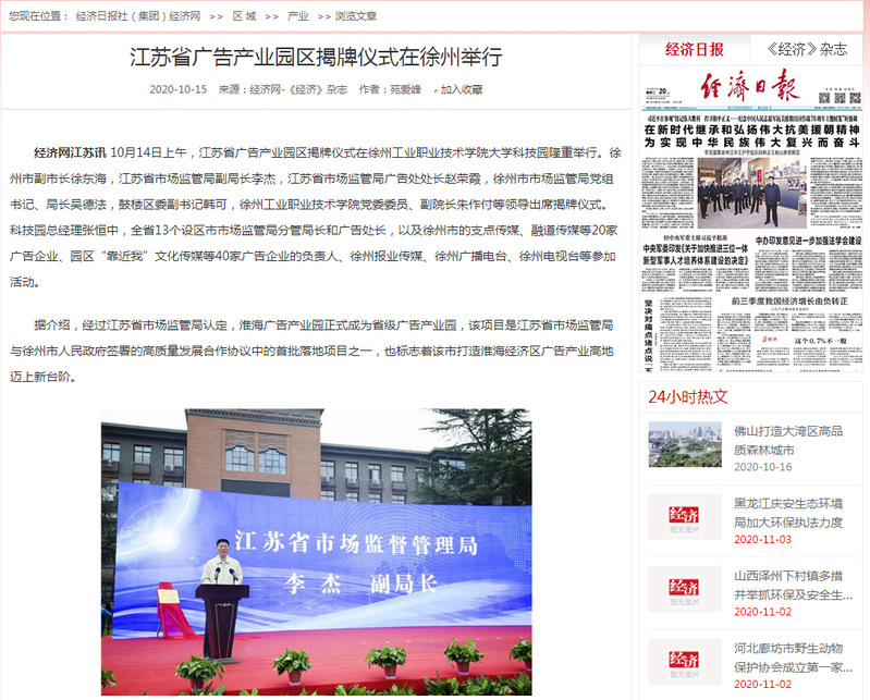 10月14日上午,江苏省广告产业园区揭牌仪式在乐动网站网页版大学科技园隆重举行。徐州市副市长徐东海,江苏省市场监管局副局长李杰,江苏省市场监管局广告处处长赵荣霞,徐州市市场监管局党组书记、局长吴德法,鼓楼区委副书记韩可,乐动网站网页版党委委员、副院长朱作付等领导出席揭牌仪式。科技园总经理张恒中,全省13个设区市市场监管局分管局长和广告处长,以及徐州市的支点传媒、融道传媒等20家广告企业、园区“靠近我”文化传媒等40家广告企业的负责人、徐州报业传媒、徐州广播电台、徐州电视台等参加活动。