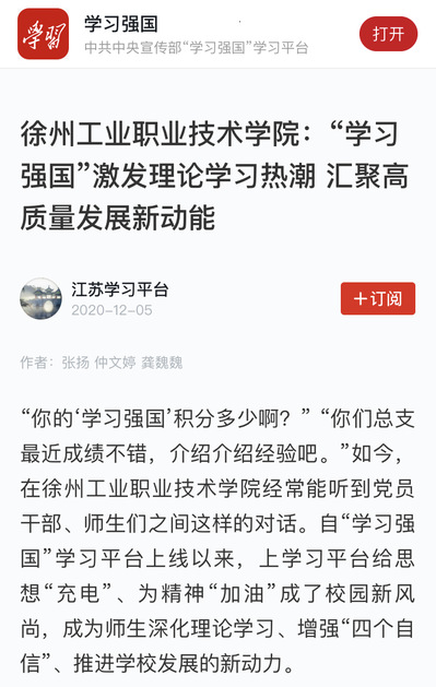 如今,利用“学习强国”学习平台开展理论学习,成为大多数师生党员的自觉行动;每天起床后、入睡前打开“学习强国”,成为很多党员的“固定动作”。“学习强国”已经成为徐工职院师生党员强化思想的理论宝库和强魄铸魂的精神家园。