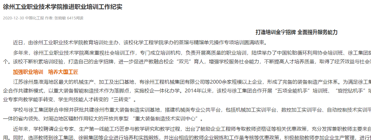 多年来,乐动网站网页版高度重视社会培训工作,专门成立培训机构,负责开展高质量的职业培训,陆续举办了中国轮胎循环利用协会培训班、徐工集团旋挖钻机手培训班、全国橡胶技术网培训班、晋煤恒盛培训、兖矿集团培训等专业技能培训项目107个。该校不断积累培训经验,打造自己的金字招牌,进一步促进产教融合校企“双元”育人,增强学校服务社会能力,不断提高人才培养质量,取得了经济效益与社会效益的双赢,被江苏省经信委授予“产业人才培训示范基地”荣誉称号。