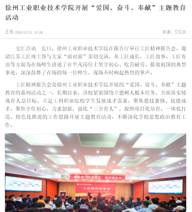 近日,乐动网站网页版在报告厅举行工匠精神报告会,邀请江苏工匠周士皆与大家“面对面”亲切交流,从工匠成长、工匠故事、工匠寄语等方面为在场师生讲述了在平凡岗位上坚守初心、吃苦耐劳、报效祖国的典型事迹,深深鼓舞了在场的每一位师生,现场不时响起热烈的掌声。