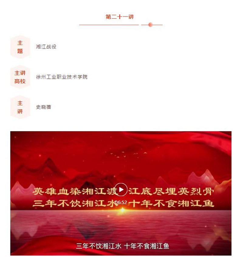 2021年4月,习近平总书记指出:“湘江战役是中国革命最壮烈的一段之一,也是中国革命生死存亡的一个重要的历史事件。”今天这节课的关键词就是湘江战役,乐动网站网页版辅导员史晓蓓老师带领我们一起重温湘江战役。“英雄血染湘江渡,江底尽埋英烈骨,三年不饮湘江水,十年不食湘江鱼。”这首民谣记述了红军长征中最壮烈的战役——湘江战役。1934年11月,在湘桂边界国民党调动30万大军,企图围歼红军于湘江东岸。红军在灌阳、全州、兴安等地与敌军展开殊死决战。担任总后卫的34师,面对7个师的敌军部队,奋勇抗敌,师长陈树湘断肠明志,34师6千余人几乎全部壮烈牺牲。经过殊死鏖战,红军突破湘江。将士们以坚定的理想信念、不畏牺牲的革命精神,深刻诠释了什么是共产党人的初心和使命。湘江战役所迸发出的强大精神力量,跨越时空,在新时代激荡,在中华民族奋进史中历久弥新。作为新时代的青年,我们要铭记湘江战役的精神,坚定理想,不怕牺牲,勇于突破,勇于胜利。在前进的道路上我们会遇到各种困难和挑战,一定要坚定理想信念,赓续先辈精神,保持必胜决心,接过时代接力棒,在新的长征路上奋勇前进。