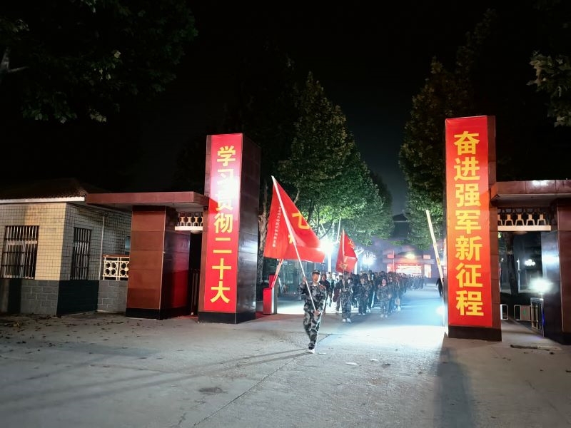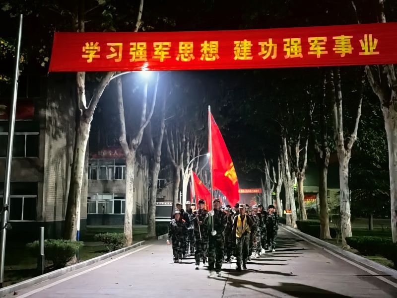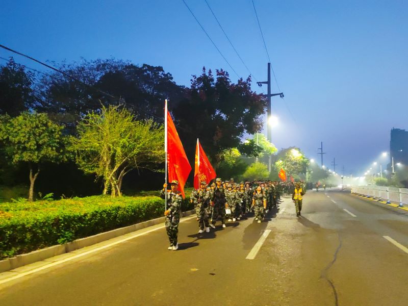 凌晨1点,军训团1-7营共3645名2023级新生按照指定地点迅速完成集结,鲍桂楠向军训团发出行进令。各营高举营、连旗,踏着整齐步伐、高喊口号,从学校东门出发,穿过九里山隧道,沿九里山古战场南岸荆马河路一路向东挺进,经中山北路,转向沈孟大道进入驻徐某部营区,在营区休整并参观相关武器装备,然后原路返回,全程约16公里,共历时5小时。