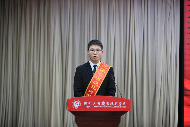 国家奖学金获得者、江苏省省级三好学生代表机电工程学院吕亮同学作了发言。吕亮同学向大家分享了入校以来的学习生活时光,总结了成长收获,真切表达了感恩之情,激励同学们用“匠心”培本铸魂,励志前行,逐梦青春的海洋,在人生的赛道上奏响时代强音。