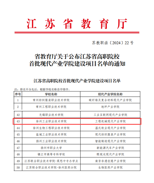 日前,江苏省教育厅正式发文《省教育厅关于公布江苏省高职院校首批现代产业学院建设项目名单的通知》(苏教职函〔2024〕22号),我校牵头申报的“工程机械现代产业学院”成功获批立项。