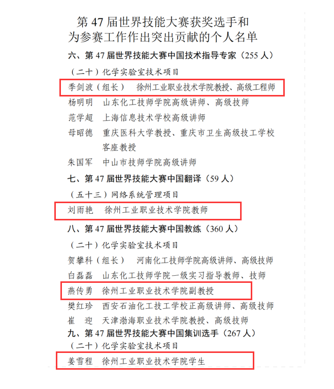 2024年11月1日,人力资源社会保障部对第47届世界技能大赛获奖选手和为参赛工作作出突出贡献的个人予以通报表扬,我校季剑波、燕传勇、刘雨艳和姜雪程等多位教师获此殊荣。