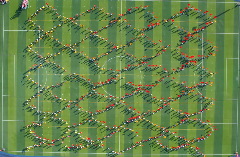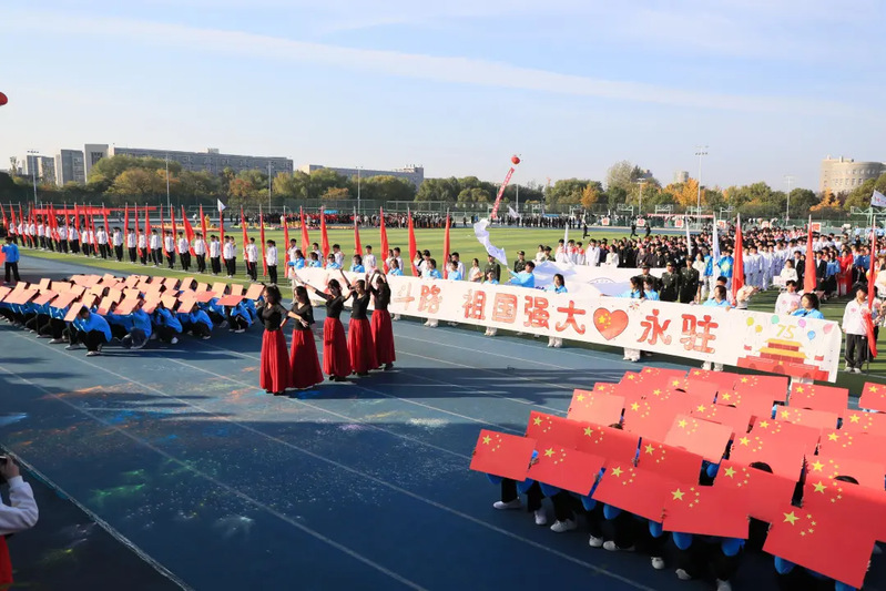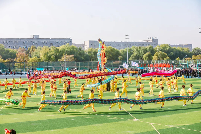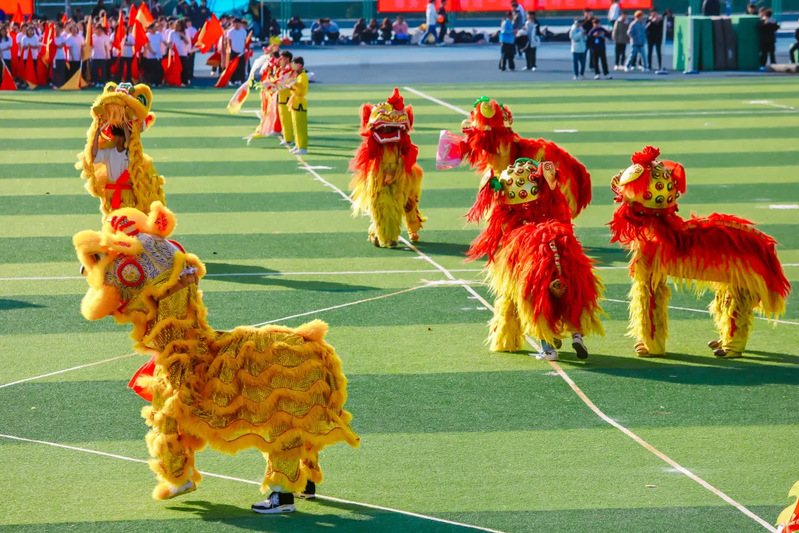 在全场的掌声中,616名同学表演了《龙腾盛世 祝福明天》大型团体操。随着激扬的鼓点响起,九条色彩斑斓的中国龙腾空而起,九色龙雾交织出一幅壮丽的天际画卷,寓意着学院多元文化的融合与蓬勃发展。紧随其后,四头北狮雄赳赳气昂昂,以其矫健的身姿展现了北方狮舞的威猛与力量,每一步跳跃都传递出不屈不挠、勇往直前的精神风貌。而四头醒狮则以更加灵动飘逸的步伐登场,它们眼神灵动,动作细腻,展现了南方狮文化的温婉与智慧,南北狮同台献艺,不仅是一场视觉盛宴,更是对中华传统文化精髓的一次深情致敬;彩旗飘飘,同学们用手中的红旗变换各种图案,“1949”“75”“1964”“2002”“2019””60”、爱心,21届等,用图案表达对党的忠诚、对祖国的热爱、对学校发展的深情祝福。