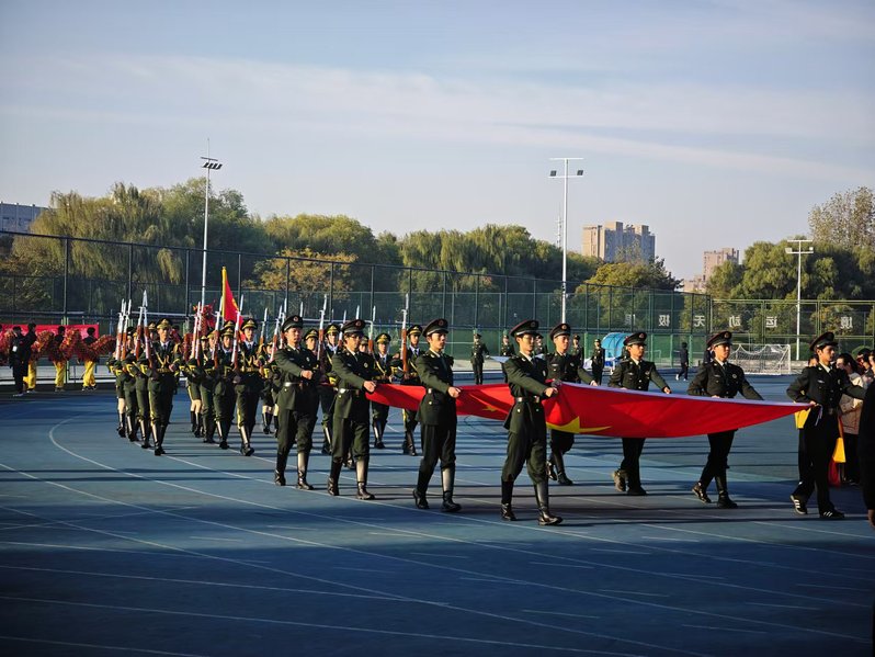 在护旗手庄重地护送五星红旗和学校校旗的引领下,各代表队依次入场。