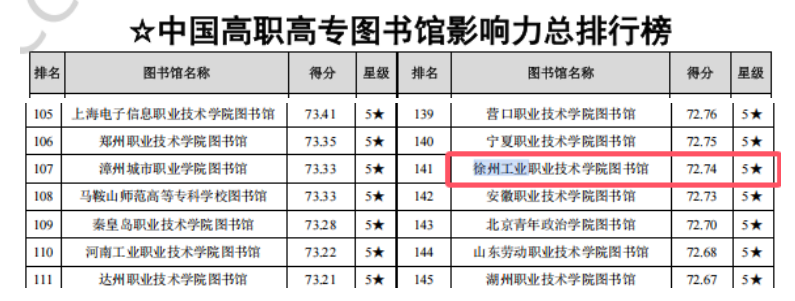 近日,武汉大学中国科学评价研究中心和中国科学学与科技政策研究会科学计量学与信息计量学专业委员会联合发布了《数智时代中国图书馆影响力评价报告(2024)》,我校图书馆从全国1545所高职、高专院校图书馆中脱颖而出,以第141名的优秀成绩荣获五星级图书馆(5★为具有突出影响力的单位,即排在最前面10%的单位)。据悉,江苏省共有19所高职高专院校被评为五星级图书馆,我校为江苏省入选的十所高水平高职院校之一。