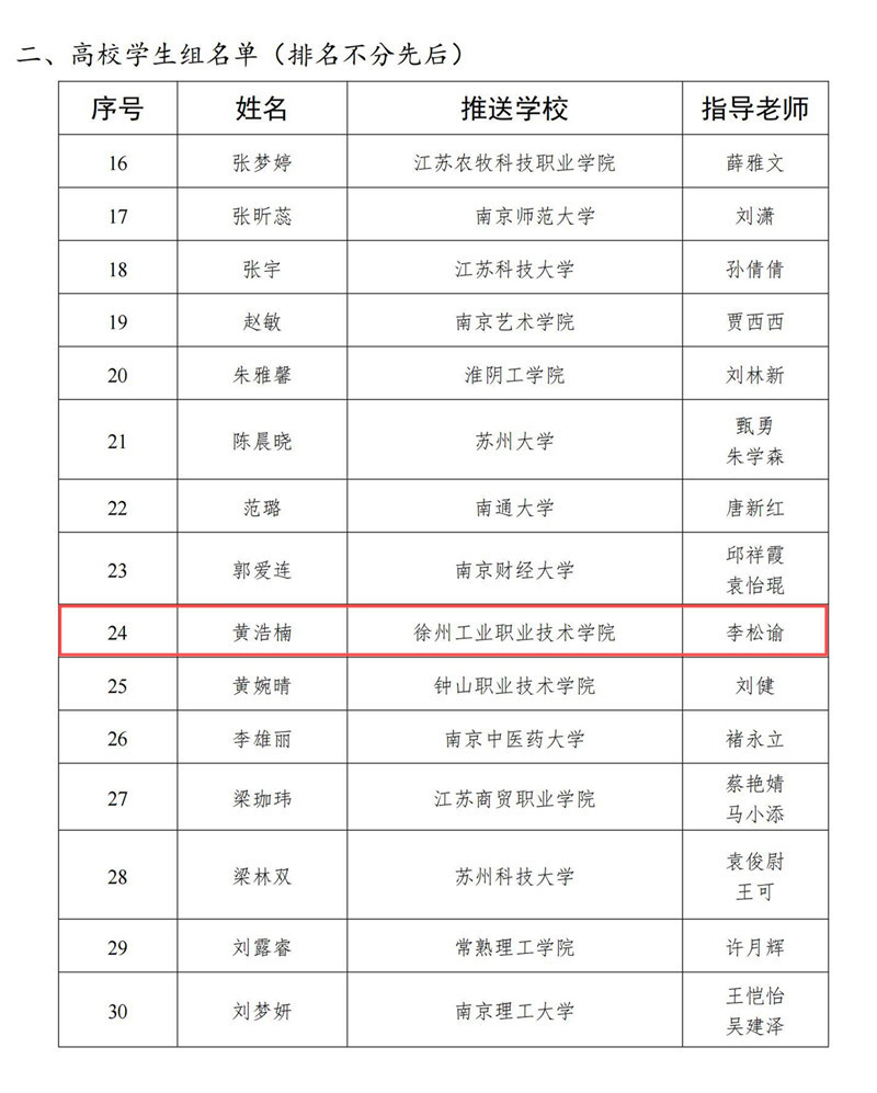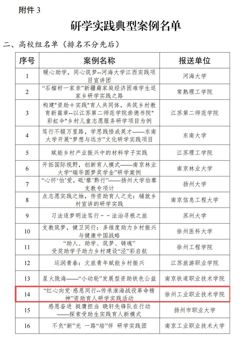 近日,江苏省教育厅正式公布了2024年“苏乡永助”资助育人主题活动的评选结果。我校在此次活动中表现突出,多个项目及个人荣获佳绩。其中,工商管理学院的“红心向党・感恩同行——传承淮海战役革命精神资助育人研学实践活动”案例荣获研学实践典型案例;化学工程学院的“织梦者行歌,资助育人谱华章”案例荣获“访家之路”典型案例。此外,学生工作处许峰老师荣获“江苏学生资助宣传大使”(资助工作者)称号,汽车工程学院新能源汽车2204班的黄浩楠同学荣获“江苏学生资助宣传大使”称号。