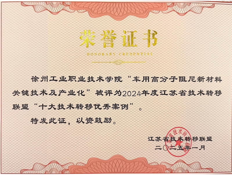 1月16日,江苏省技术转移联盟2024年度会议在江苏省会议中心隆重举行,我校“车用高分子阻尼新材料关键技术及产业化”被评为2024年度江苏省技术转移联盟“十大技术转移优秀案例”,是省内唯一获此奖项的高职院校。