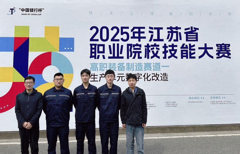 3月27-30日,2025年江苏省职业院校技能大赛高职组“生产单元数字化改造”赛项在江苏信息职业技术学院举行。本次比赛吸引了来自全省26支队伍参加比赛。经过激烈角逐,我校机电工程学院詹国兵、余心明、王伟男三位指导老师指导的工业机器人2301班刘恩泽、机电一体化(3+3)2301班李光耀、机电一体化2304班王治理三位同学以单项分和总分均为第一名的优异成绩斩获一等奖。