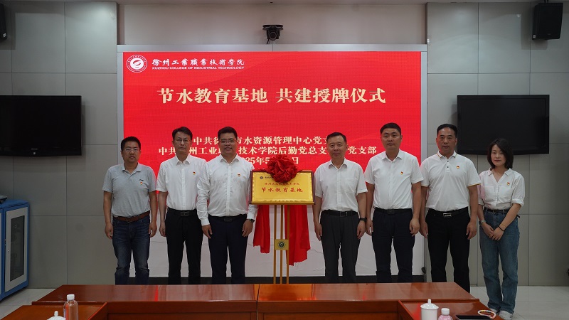 揭牌仪式上,孙健身对徐州水资源管理中心一行到来表示热烈欢迎,他简要介绍了学校的基本情况及节水成效,希望双方共同努力将节水教育基地将打造成为‘政-校-社’联动的绿色标杆。巩庆伟详细汇报了学校节水工作成果及“党建+节水”品牌创建情况。李心茹就未来节水教育基地的建设构想进行了分享。顾宏威对我校节水工作给予高度评价,并介绍了徐州市近年来水资源治理重点工作,希望以此次共建为契机,深化双方合作,形成节水教育合力,共同推进水资源保护事业高质量发展。随后,双方代表共同为“节水教育基地”揭牌,并就党建品牌创新、业务融合发展、节水教育基地建设等内容进行了交流。