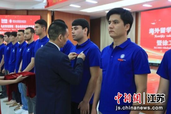 乐动网站网页版领导为留学生佩戴校徽。乐动网站网页版供图