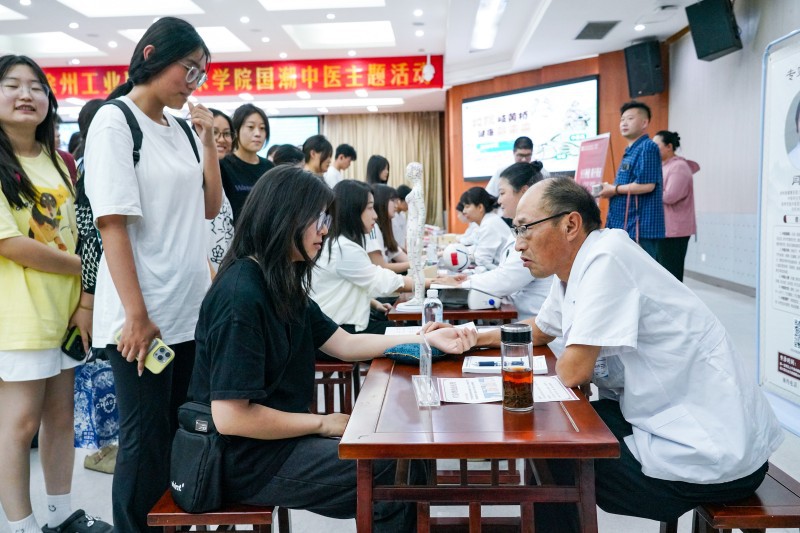 活动现场,最受学生热捧的当属“岐黄手作·指尖国医”文创实践区。文创实践区艾叶薄荷香囊、UV胶封存药材书签、中药耳饰等创意作品琳琅满目。生物制药专业学生亲手研磨药材制作合香珠手串,将佩兰、丁香等草药转化为时尚配饰。“原来中医可以这么‘潮’!”参与香囊制作的学生感叹。药膳体验区同步推出酸梅汤、甘麦大枣茶等养生饮品,让“药食同源”理念融入日常。中医诊疗体验区人头攒动。中医专家通过脉象浮沉迟数解析体质虚实;现场义诊区正骨医师针对长期伏案导致的颈椎问题,以精准手法调整关节,现场响起清脆的复位声,学生直呼“手到痛消”;针灸区银针轻旋入穴,针对肩颈酸痛、失眠等常见症状施治,体验者感受着经络疏通后的温热流动。