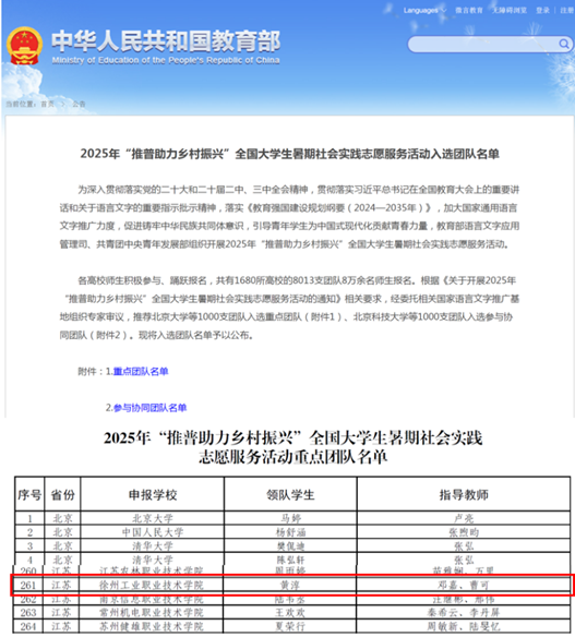 近日,教育部公布了2025年“推普助力乡村振兴”全国大学生暑期社会实践志愿服务活动入选团队名单,由我校基础教学部邓嘉老师、曹可老师指导的“乐动网站网页版赴贵州黔东南苗族侗族自治州推普实践团”凭借扎实的准备工作、创新的活动方案和突出的服务能力成功入选全国重点团队。此次活动由教育部语言文字应用管理司、共青团中央青年发展部联合开展,参与本次评选共有来自北京大学、清华大学等全国1680所高校的8013支团队8万余名师生报名参与。这次入选标志着我校在响应国家号召、服务社会发展方面迈上了新台阶,实现了在社会实践上的新突破。