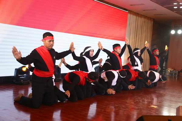 此情此景,如何缺少得了南亚的风情。来自印度尼西亚的同学,表演了精彩的《爪哇舞》,只见双目微闭,正襟危坐,伴随着有节奏的歌曲声,他们互相配合着身姿的变化和手指的开合,做出各种高难度配合的集体动作,好似海浪翻滚,又似岗岭起伏,令人惊叹不已。来自老挝的同学,表演了《南旺舞》,舞者随着高低抑扬的曲调,或停或走,或蹲或立,或相互转圈,或相互拍手,或金鸡独立,或相互勾臂,轻盈而欢快,明媚而多姿。使观者身心陶醉,令听者如痴如迷。