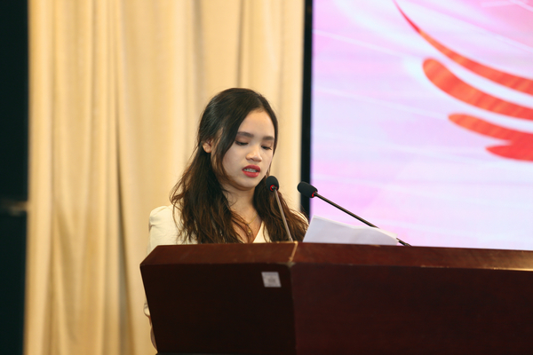 来自老挝的李美凤同学,代表新生发言。她希望新同学们珍惜在徐工院求学的宝贵机会,努力学习,深入体验中国文化,遵守中国的公序良俗,与老师同学融洽相处,成为一个相亲相爱的大家庭。