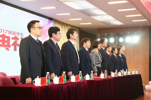 典礼在庄严的《中华人民共和国国歌》声中拉开帷幕。王建华副处长首先介绍了与会领导和嘉宾,并邀请出席领导和嘉宾为2017级留学生代表佩戴校徽。