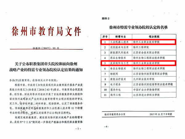 11月7日,徐州市教育局文件公布了“面向徐州战略产业特需专业”(徐教职[2017]33号)评选结果,我校 “工业机器人技术”、 “皮具制作与工艺”两个专业获立项。