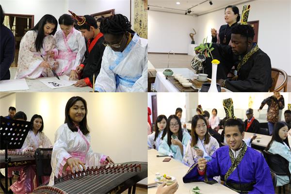 为迎接第72个世界大学生日,11月15日,化学工程学院联合招生与国际交流处组织了国内外四十余名大学生共同来到徐州市工人文化宫,开展“携手世界青年,传承中华文化”活动。来自18个国家和地区,不同民族、信仰、肤色、发色的同学们身着汉服,在中国的墨色氤氲,茶香袅袅中,体味中华文化的精致与高雅;在琴音天籁,淋漓写意中,体悟五千年积淀的厚重和基因。