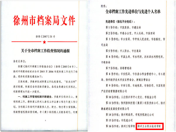 近日,徐州市档案局下发文件[徐档2017]31号,通报了徐州市2016、2017年档案工作检查情况。我校综合档案室在第16协作组(院校组)中荣获先进集体称号,是全市院校组中两所获奖院校之一。