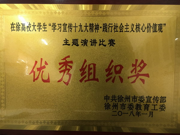 近日,徐州市“学习贯彻十九大精神 践行社会主义核心价值观”大学生演讲比赛圆满结束,我校喜获“优秀组织奖”。