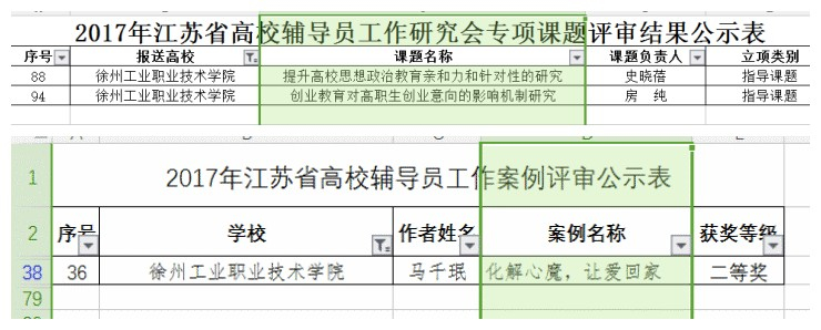 2月24日,江苏省高校辅导员工作研究会发布了《关于公布2017年江苏省高校辅导员工作研究会专项课题立项结果的通知》(苏高辅研﹝2018﹞1号)和《关于公布2017年江苏省高校辅导员工作案例评审结果的通知》(苏高辅研﹝2018﹞2号)。我校申报的《提升高校思想政治教育亲和力和针对性的研究》(史晓蓓)和《创业教育对高职生创业意向的影响机制研究》(房纯)两项课题均获指导项目立项,《化解心魔,让爱回家》(马千珉)荣获辅导员工作案例二等奖。