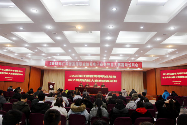 3月1日,江苏省高职院校电子商务技能大赛赛项说明会在我校图书馆多功能报告厅召开。学校副院长张芳儒,中教畅享(北京)科技有限公司副总经理潘洪锋、工商管理学院院长张恒中,以及来自全省47所高职院校的领导和教师代表共90余人参加会议,会议由教务处处长李荣兵主持。