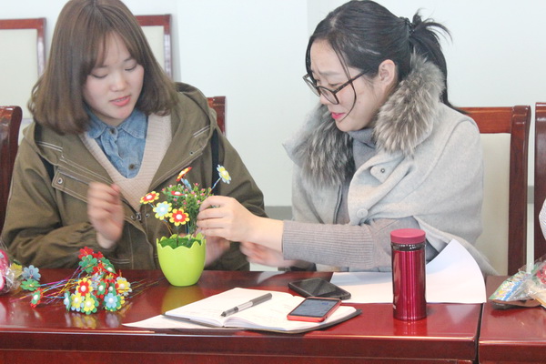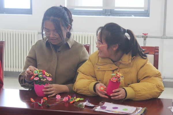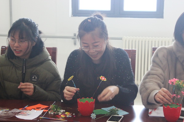 活动中,师生其乐融融,一起聊着开心的事情,一起配合着完成着自己的盆花。团总支书记郝红艳老师说:“手工制作的乐趣在于不仅可以制作出各种不同的工艺品,而且手工制作对大家开学初的各种心理紧张有很好的减压作用,还培养了一种新型低碳生活理念;同时,自己动手制作出来的盆花精美漂亮,是一份很好的庆祝自己节日的礼物,特别的爱给特别的自己,能够带来一天的好心情!”