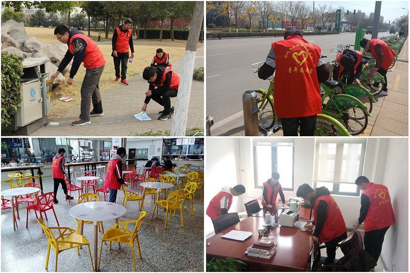 机械设计171、工业机器人171、机械制造171、机械制造172、过程自动化171等团支部共同争做校园美容师,帮助任课老师打扫办公室、清洁餐厅环境、清理校园小广告,从身边小事做起,美化净化校园环境.