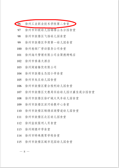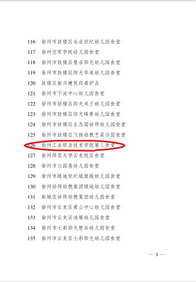 近日,徐州市食品药品监督管理局下发文件[徐食药监食餐2018]44号,通报徐州市2017年度餐饮服务食品安全监督量化分级管理市级A级单位检查确认结果,我校第二食堂、第三食堂分别获得“徐州市2017年度餐饮服务食品安全监督量化分级管理市级A级单位”的称号。这是对我校餐饮管理工作的肯定。在今后的工作中,国有资产管理与后勤服务中心将持续提升餐饮精细化管理水平,不断更新服务理念,注重细节和实效,加快健康餐饮、文化餐饮、智慧餐饮建设,为我院高水平高等职业院校建设保驾护航。