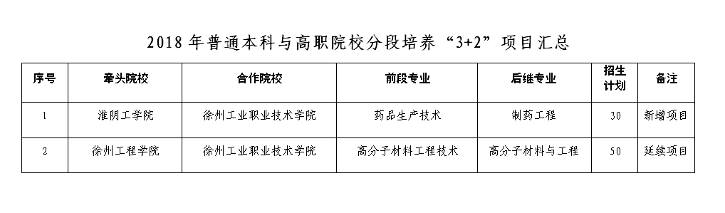 近日,从江苏省教育厅《省教育厅关于公布2018年江苏省现代职教体系建设试点项目的通知》(苏教职〔2018〕7号)文件获悉,我校2018年现代职教体系“3+3”试点项目共申报14项,获批13项,比2017年新增5项,取得历史性突破。另悉,在江苏省公布的2018 年普通本科与高职院校合作培养高素质技术技能人才项目中,我校与淮阴工学院联合申报的“药品生产技术专业”普通本科与高职院校分段培养“3+2”新增项目、与徐州工程学院联合申报的“高分子材料工程技术专业” 普通本科与高职院校分段培养“3+2”延续项目,全部获批。
