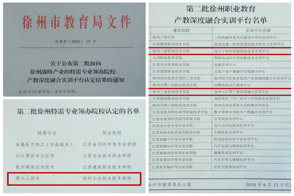 2018年,第二批面向徐州战略产业的特需专业领办院校和产教深度融合实训平台认定,我校“煤化工技术”专业获得徐州市特需专业领办院校认定,“高分子材料智能制造技术实训平台”、“徐州云计算产教深度融合实训平台”获徐州市产教深度融合实训平台认定,这是我校继2017年获得“工业机器人技术”、“皮具制作与工艺”2个徐州市特需专业领办院校认定及“徐州工程装备智能制造产教深度融合实训平台”、“徐州现代物流技术实训平台” 2个徐州市产教深度融合实训平台认定之后取得的又一骄人成绩。