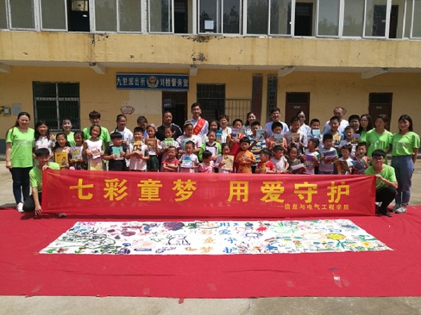 留守儿童作为一个新时期的特殊群体,由于亲情关爱缺失,家庭教育缺乏,在安全方面存在较大的隐患。为了积极响应国务院《关于加强农村留守儿童关爱保护工作的意见》的政策,促进留守儿童健康、全面成长,信电学院成立了“七彩童梦,用爱守护”暑期社会实践团,走进“百千万”结对帮扶对象九里刘楼社区,开展爱心帮扶活动。