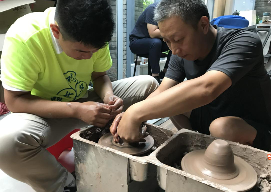 7月15日,材料学院暑期志愿者们寻访了非物质文化遗产传承人闵思凡老师,闵老师将陶器制作的前世今生的故事娓娓道来,并向实践团的成员演示陶碗、陶罐、花瓶的制作过程。在闵老师的现场讲解、示范和指导下,暑期社会实践志愿者“小青葱”们都全神贯注,从定中心、开孔、修正成型、取胚完成,一步步认真学习,个个摩拳擦掌跃跃欲试。志愿者于程千是团队中“第一个吃螃蟹的人”,可看似简单的工序,却既考验手上功夫。泥巴到了手里却不听了使唤,闵老师则在旁一边鼓励指点,一边手把手帮其纠正姿势,一只陶碗在两分钟内就诞生了。同学们其乐融融,制作现场一片欢声笑语,大家都制作了属于自己的第一份陶艺作品。