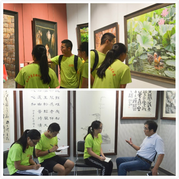 为了让大学生们初步了解并直观感受工笔画带来的意境美,实践团的首站来到了位于徐州市铜山区棠张的喻继高艺术馆。一下车同学们就仿佛进入了艺术的殿堂,艺术馆院内花木幽美,池塘亭榭,奇石雕鹤,馆内更展出了百余幅中国历代工笔画的佳作,其中很多都是我国著名工笔画家喻继高先生的真迹,同学们跟随者解说员在一幅幅作品前,研究讨论,流连忘返,无不被工笔画清新淡雅的色彩、细致流畅的线条,传神生动的感染力所震撼。来自国际学院的韩美现同学更是兴致盎然,拿出手机一直拍摄,要把这些作品通过网络分享给韩国家乡的朋友们。为了对比学习,实践团还参观了在徐州艺术馆举办的“惟美無界—当代朝鲜油画精品巡展”,感受不同国家不同技法的绘画与我国工笔画的异同。