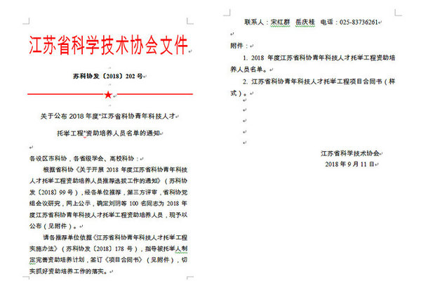 近日,江苏省科学技术协会下发了 “关于公布2018年度“江苏省科协青年科技人才托举工程”资助培养人员名单的通知“(苏科协发〔2018〕202)号),我校机电工程学院李建松老师入选。