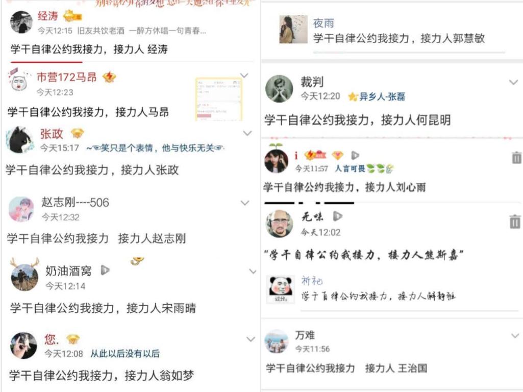 此次活动主要通过线上的方式进行,以团委微信公众号平台为主阵地,进行自律公约线上接力。 活动一经发起,校学生会、社团联合会、校级其他学生组织、各二级学院学生会、社团联合会及班长、团支书等学生干部纷纷积极响应,转发公约并附言署名,表明自己杜绝功利化、庸俗化、不忘初心恪守学干本分的觉悟与决心,响应热烈导致QQ空间一度呈现被“霸屏”的状态,微信该篇文章的阅读量在一天之内接近两千。