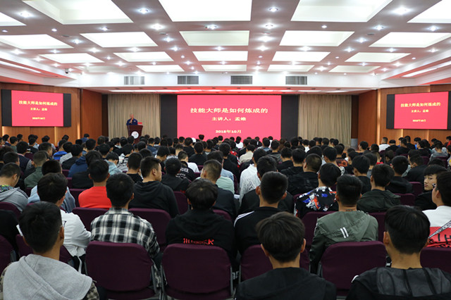 孟维教授用自己的故事阐述了做事情要坚持更要用心的道理,告诉大家要充分利用学校的资源,树立学好技能的目标,理论联系实践,不断提高自己的技能水平;在学习和工作中要有高度的责任心,敢于挑战,勇于担当,一丝不苟,精益求精,这也正是“工匠精神”的基本内涵。现场师生从他的话语中感受到了大师所具有的严谨、敬业的工作态度,敬佩之情油然而生、受益匪浅,现场掌声雷动。