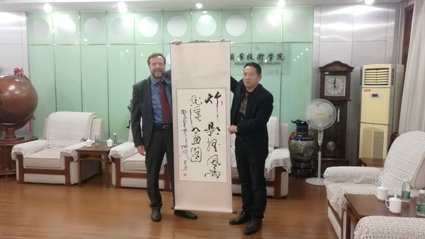 建筑工程学院陈砚池教授为远道而来的客人赠送了书法作品,祝愿中德友谊源远流长。