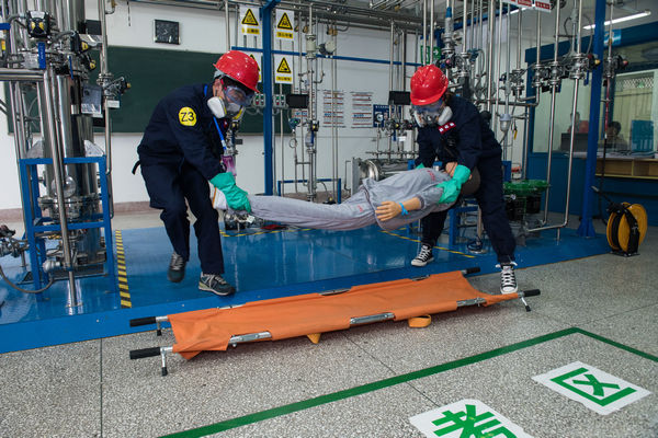 “现代化工HSE应用技能竞赛”包括HSE理论知识考核、化工安全事故应急救援桌面推演以及体感式HSE装置操作三个竞赛单元。HSE技能竞赛桌面推演项目选取重特大化工安全事故案例,采用3D动画技术模拟事故场景,参赛队员自主选取角色,执行人物指令,进行隐患排除、事故处置和应急救援等技术活动。HSE理论知识考核个人对化工安全、环境保护和职业卫生等方面的知识与技术及法规的掌握。体感式HSE装置操作项目采用了班组联合操作,用电子脉冲信号模拟物料投放,用声光电气模拟安全事故环境,在仿真实景中,进行安全事故处置操作。
