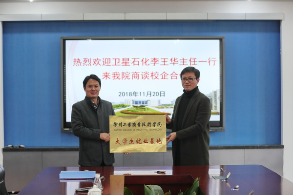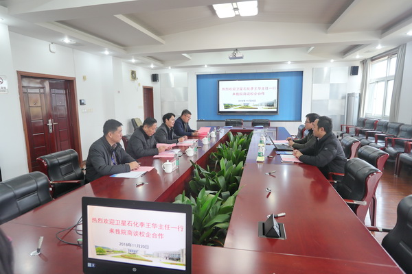 11月20日,浙江卫星石化股份有限公司董事长办公室副主任、人资行政中心副总监李王华,卫星石化连云港基地人事经理卢春雷一行来我校洽谈校企合作事宜。我校副院长朱作付,化工学院党总支书记季剑波、就业指导服务中心副主任宁军胜、化工学院副院长高强出席了会议。