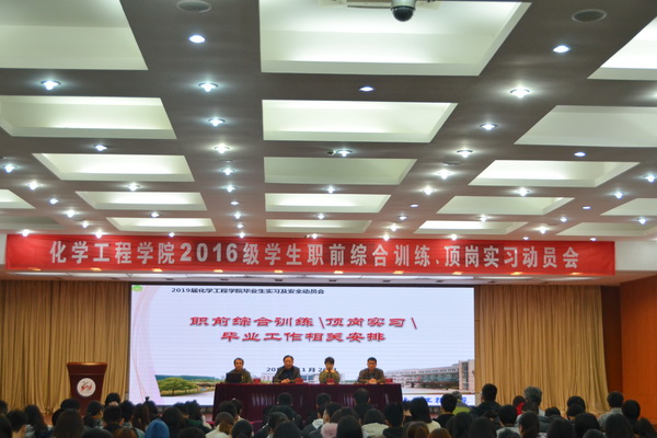 11月26日,化学工程学院2016级学生职前综合训练、顶岗实习动员会在图书馆报告厅举行。化工学院党总支书记季剑波、院长孙婷婷、副院长刘郁、高强出席本次会议,2016级班主任、顶岗实习指导教师、辅导员、全体同学参加了本次动员会,会议由高强主持。