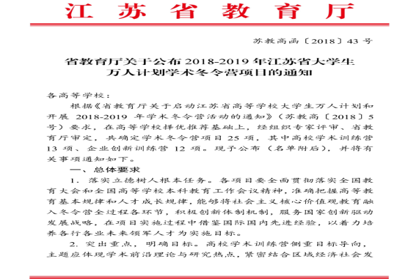 【荣誉】我校获“2018-2019年江苏省大学生万人计划学术冬令营项目”立项