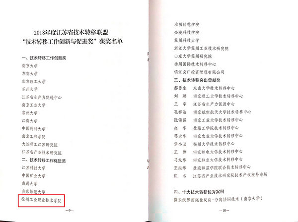 会议对2018年度江苏省技术转移工作情况进行了总结,并对“2018年度技术转移工作创新与促进奖(第一届)”的获奖单位及个人进行了表彰。本年度,共评选出“创新奖”12个、“促进奖”12个、“突出贡献奖”12个以及“十大优秀案例”,我校成功入围并获评“技术转移工作促进奖”,成为全省唯一入围获奖的高职院校。