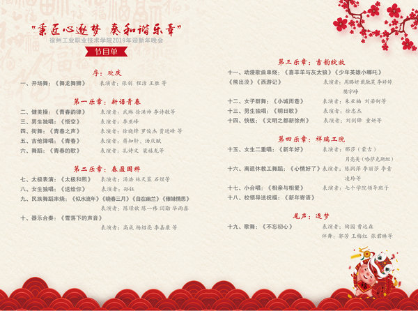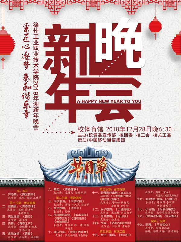 适逢我校建校55周年之际,围绕我校高水平示范校建设和中国特色高水平高职院校创建工作要求,为进一步提升我校校园文化建设水平,同时也为给师生营造浓郁的节日氛围,我校党委宣传部、校团委、校工会、校关工委将为全校师生呈现一场热闹祥和、节日氛围浓郁的2019年新年晚会,热烈欢迎广大师生前往观看。