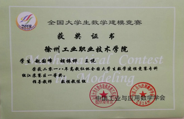 2018 年全国大学生数学建模大赛由中国工业与应用数学学会由主办,是大学生建模大赛最高赛。全省专科组约有近200个团队参赛,我校由赵国峰、胡振桦、王悦三位同学组成的团队,成绩优异,荣获江苏赛区一等奖,这是继去年之后再次问鼎这一奖项。